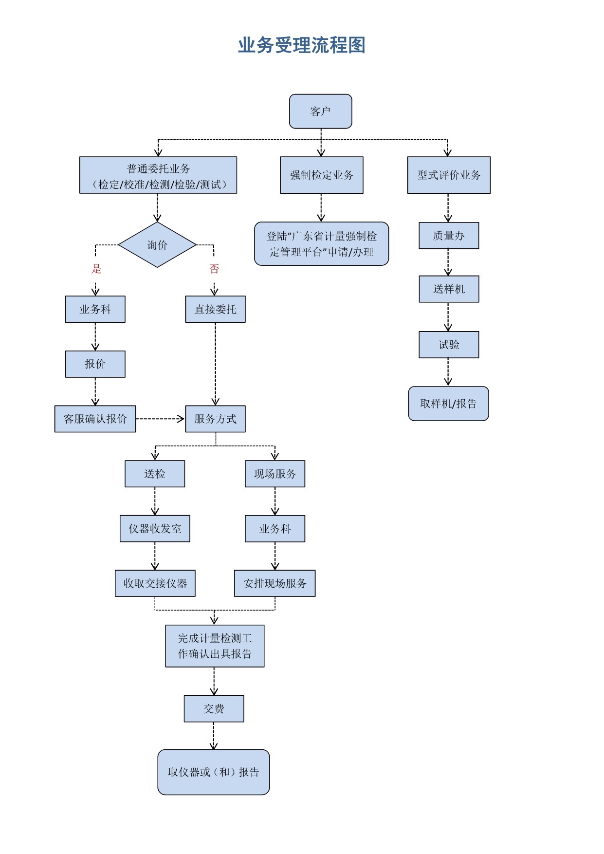 华南国家计量测试中心/广东省计量科学研究院(SCM)热诚欢迎客户到我单位办理业务,SCM本着“公正、科学、准确、诚信,质量第一、信誉第一”的质量方针,努力营造宾至如归的服务环境和氛围,保证以最好的服务态度,最快的检测速度,以及合理的收费向客户提供准确可靠的检测数据,满足客户的检测要求,热情地欢迎客户提出宝贵意见。如果客户对我单位业务办理流程有任何疑问,请参考下面业务流程图的介绍: