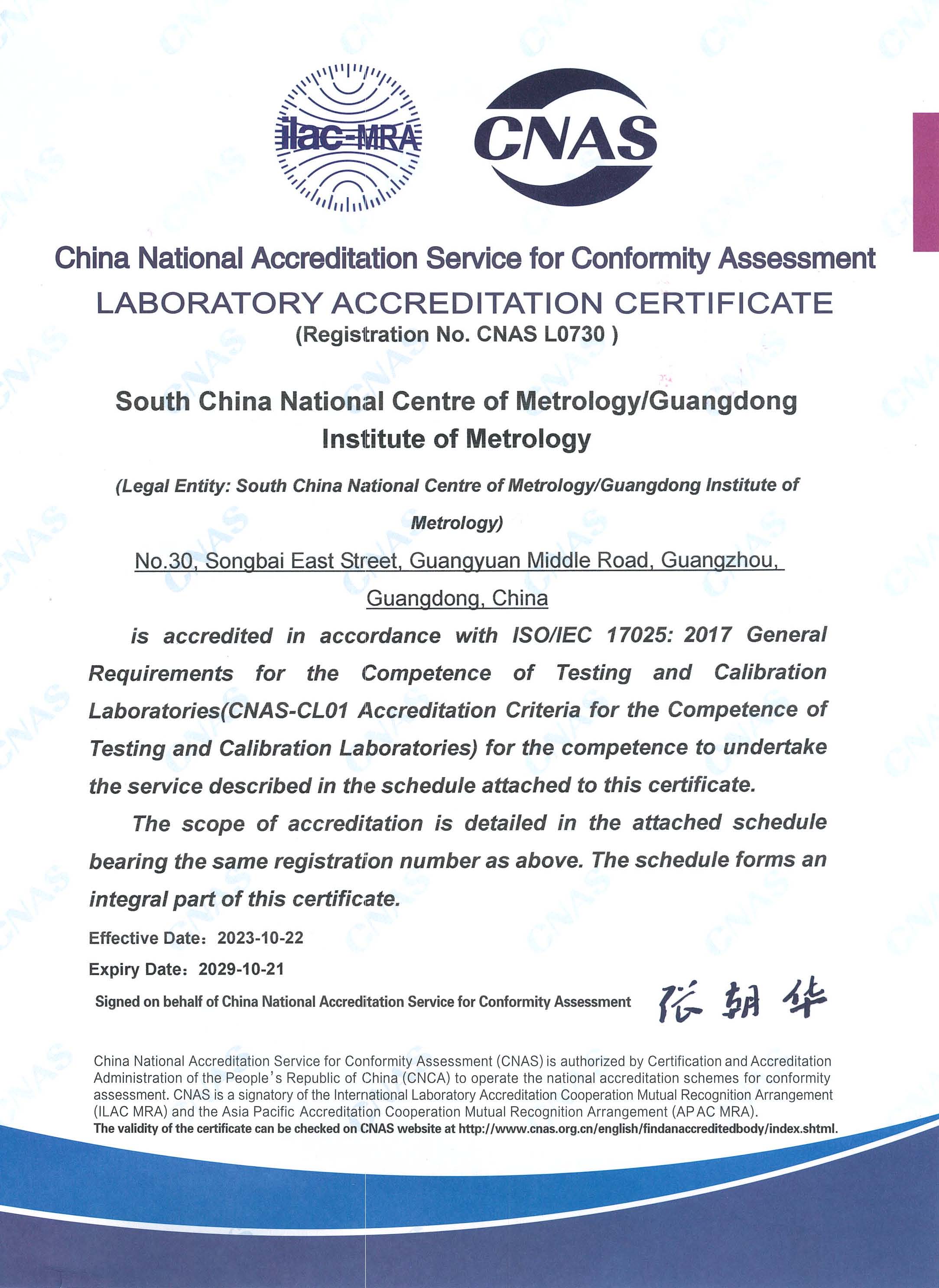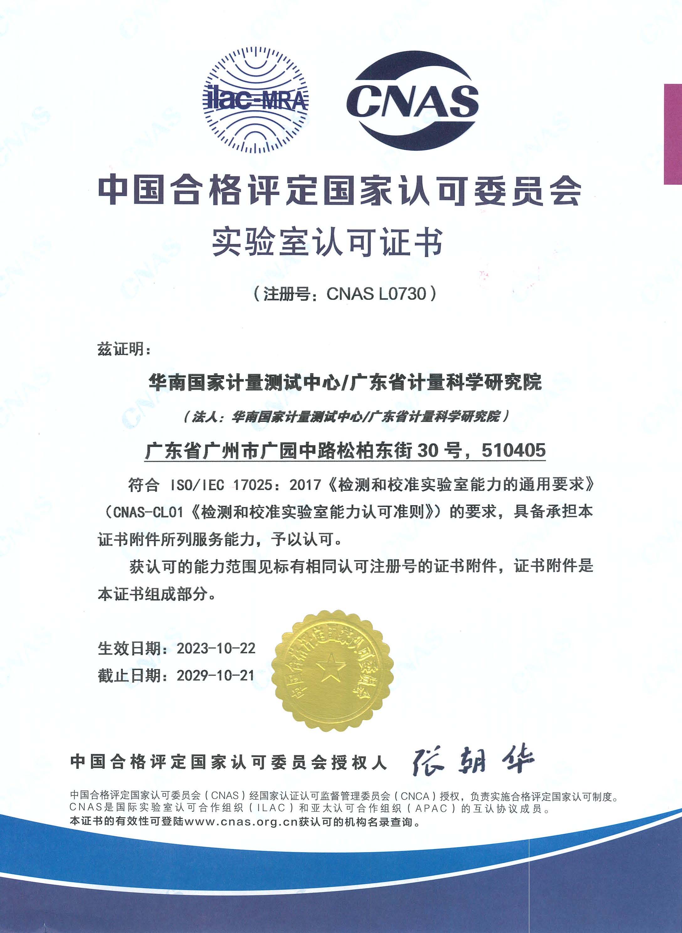 华南国家计量测试中心/广东省计量科学研究院是经中国合格评定国家认可委员会(CNAS)认可的第三方检测和校准实验室(注册号:CNAS L0730),是我国首家接受CNAS(原CNACL)评审的校准实验室。